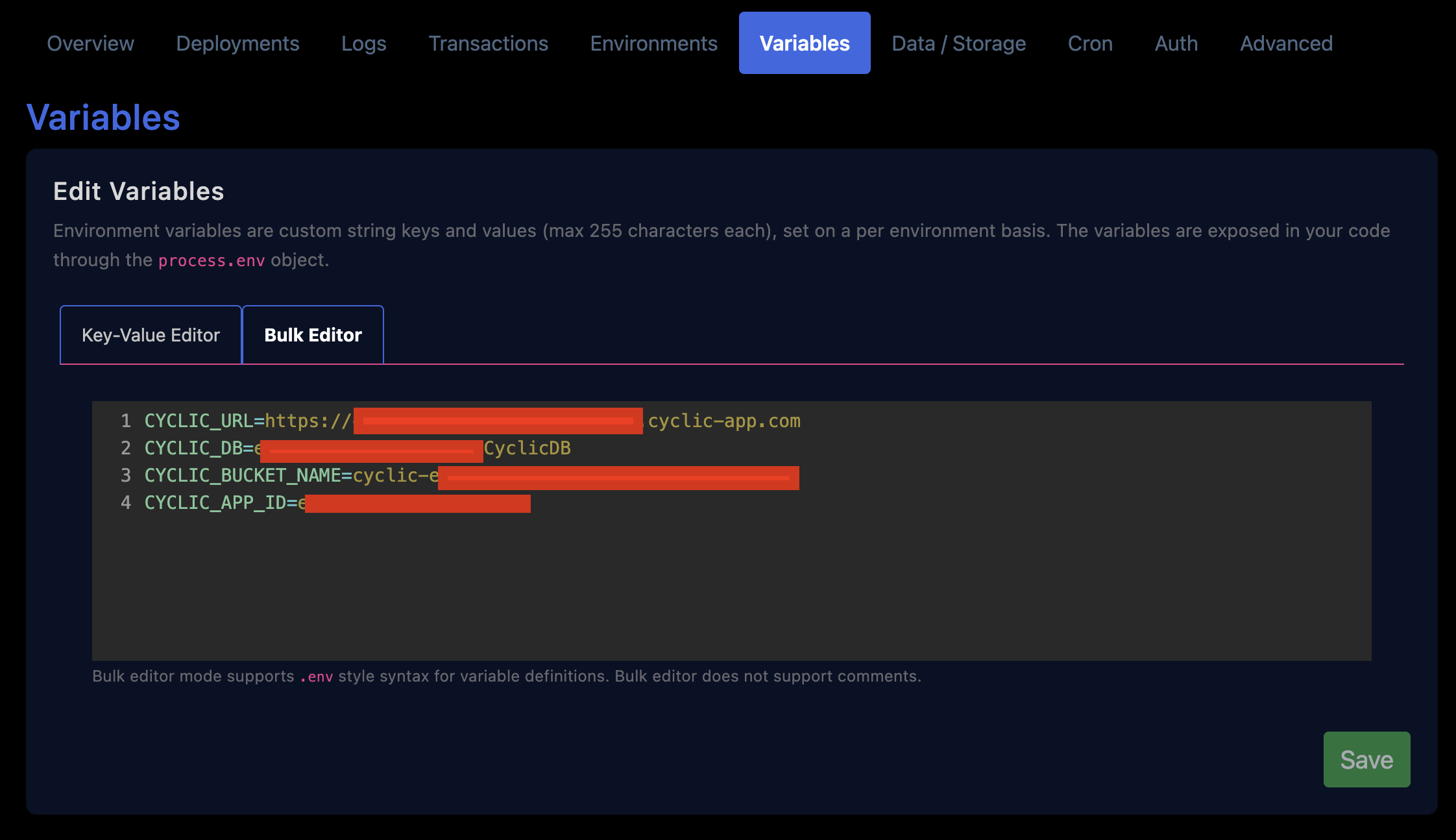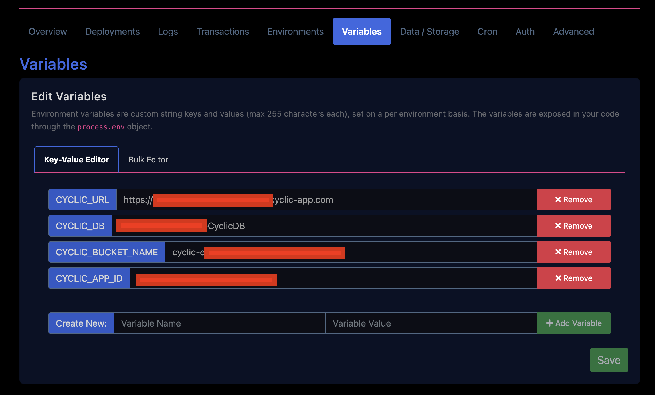 • CYCLIC_DB - the name of the AWS DynamoDB table available to the app